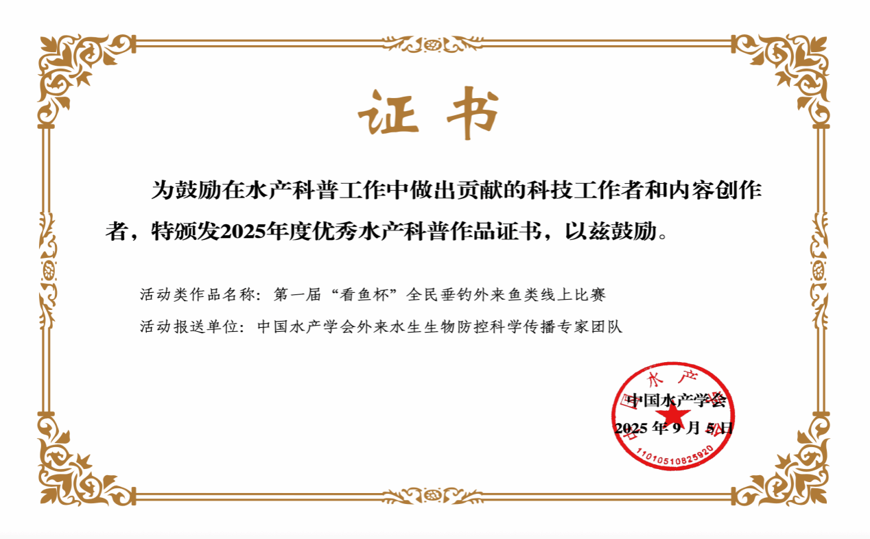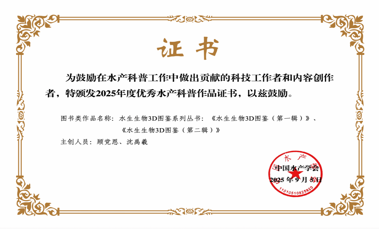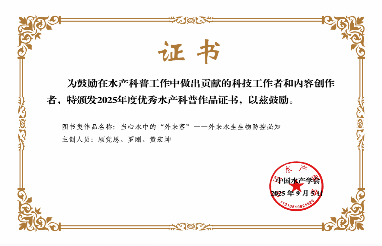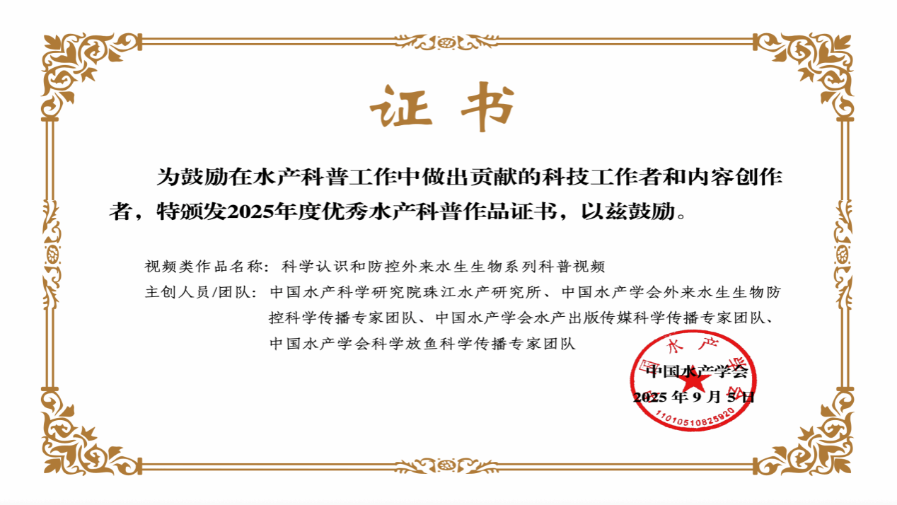 9 月,中国水产学会公布了2025年度科学传播专家团队和优秀科普作品评选结果:珠江所牵头的“外来水生生物防控科学传播专家团队”再次入选“中国水产学会科学传播专家团队” ,牵头完成的《当心水中的“外来客”-外来水生生物防控必知》、“水生生物3D图鉴系列丛书:《水生生物3D图鉴(第一辑)》、《水生生物3D图鉴(第二辑)》”、“科学认识和防控外来水生生物系列科普视频”、“第一届“看鱼杯”全民垂钓外来鱼类线上比赛”等4项作品分获图书类、视频类、活动类优秀科普作品。