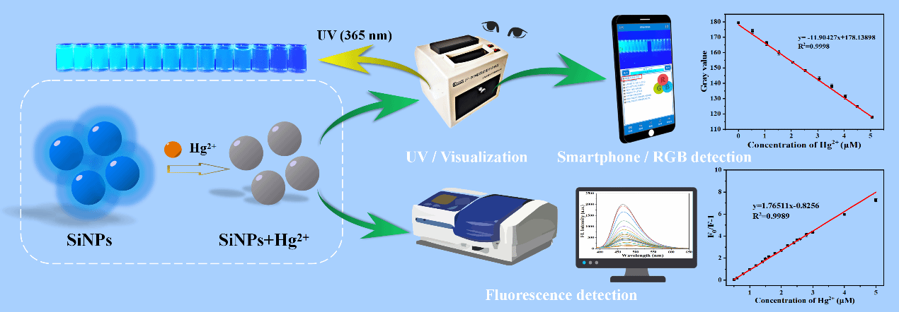 汞离子(Hg²⁺)作为一种常见且具有强生物累积性的重金属污染物,传统检测方法存在设备价格昂贵、操作繁琐以及无法实现实时监测等问题,团队采用微波辅助法快速合成了粒径为3 nm的硅量子点(SiNPs),当Hg²⁺存在时,SiNPs会发生荧光猝灭及蓝色荧光颜色变暗。基于这一机理,团队借助智能手机采集荧光图像,并将图像的RGB值转换为灰度值,构建出便携式智能手机传感分析法,实现了检测限低至3 nmol/L Hg²⁺的高灵敏检测。在实际环境水样(包括自来水、河水和海水)的测试中,该方法的回收率达到80.3%–113%,并且能够抵抗31种不同离子的干扰,整个检测过程可在15分钟内完成。