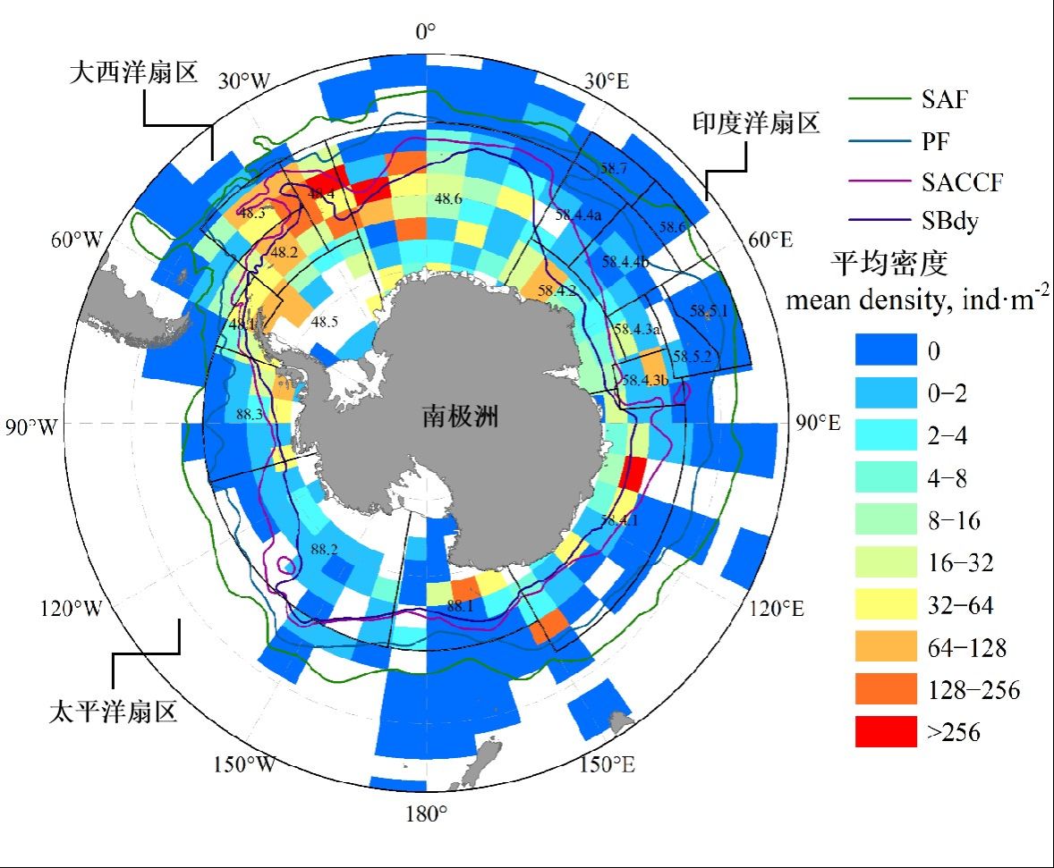 南大洋南极磷虾资源密度及主要锋面分布示意图