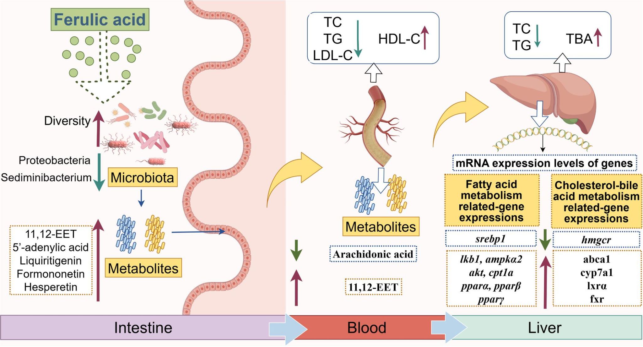 阿魏酸(FA)是一种在植物界普遍存在的羟基环肉桂酸衍生物,具有清除自由基、提高抗氧化性能、抗炎性能以及降低血脂的生理作用。团队前期研究表明,植物提取物阿魏酸能够提高团头鲂生长性能、抗氧化和抗炎性能,降低细胞凋亡水平,维持肝肠内质网稳态。本研究聚焦探讨阿魏酸经“肠肝”轴影响团头鲂脂质代谢的机制,发现阿魏酸通过影响肠道菌群结构,提高肠道和血浆中脂质代谢相关小分子物质的分泌,促进胆固醇转化为胆汁酸,抑制脂肪酸和胆固醇合成,进一步在脂质代谢调节中发挥关键作用。
