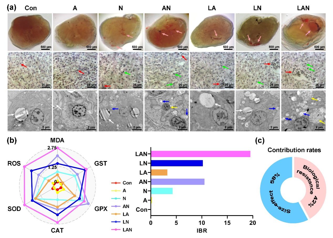 本研究以海洋模式生物海水青鳉(O. melastigma)为研究对象,系统探讨了其在海洋酸化条件(pH 7.40)下暴露于环境相关浓度纳米TiO₂颗粒后的生理响应与分子水平变化。研究发现,海洋酸化在一定程度上减缓了纳米TiO₂颗粒在海水中的聚集与沉降行为,提高了其生物可利用性,同时削弱了鱼类对纳米颗粒胁迫的抵抗能力。生物蓄积实验表明,海洋酸化条件下鱼体对纳米TiO₂颗粒的富集量显著上升,其中肝脏是主要的富集器官,并伴随出现氧化应激和病理损伤,最终诱发明显的肝毒性。通过整合生物标志物法量化了海洋酸化调控纳米颗粒毒性的关键驱动因素:纳米颗粒的尺寸效应贡献约为58%,而生物的抵抗能力下降贡献约为42%,表明纳米颗粒在酸化条件下的粒径变化是决定其毒性效应的主要因素。转录组分析显示,在海洋酸化与纳米颗粒联合暴露条件下,海水青鳉肝脏中与基因转录和翻译相关的生物学过程受到显著抑制,同时细胞衰老及程序性细胞死亡相关信号通路被激活。