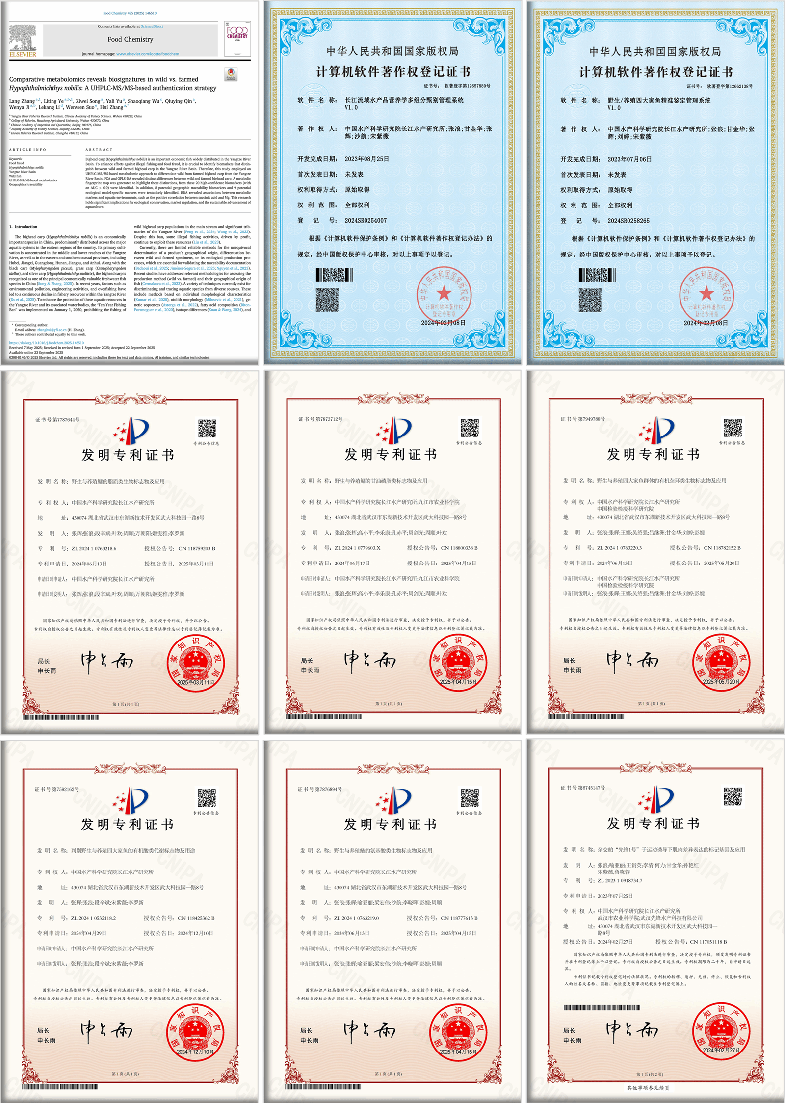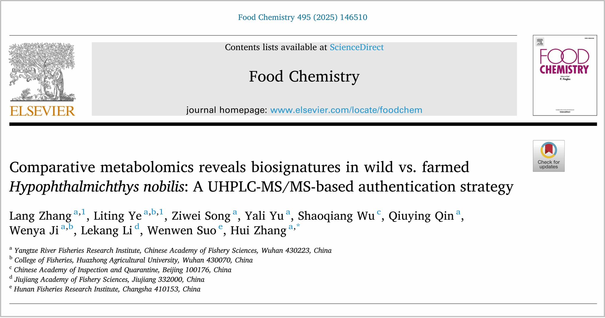 近日,中国水产科学研究院长江水产研究所在鉴别野生与养殖鳙的生物标志物研究方面取得新进展,该研究基于 UHPLC-MS/MS 品质甄别技术揭示关键生物标志物,为鱼类鉴别溯源提供了科学策略,相关成果在中科院一区 Top 期刊《Food Chemistry》(IF2024=9.8)发表。