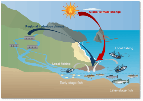 研究成果表明:(1)过去半个世纪以来,中国三大典型河口——长江口、黄河口和珠江口的鱼类丰度(数量)持续下降,而物种丰富度(种类数)除黄河口外基本保持稳定;(2)多尺度威胁因素对不同生活史阶段鱼类影响显著:捕捞强度与成鱼丰度显著负相关,是驱动成鱼数量下降的主因;鱼卵和仔稚鱼丰度则与上游淡水输入负相关、与泥沙输入量正相关,表明水沙失衡已成为限制早期生活史阶段补充的关键因素;(3)全球变暖导致海表温度上升,促进暖水种迁入,使部分河口(如珠江口)出现物种多样性增加的现象,但总体生物量下降趋势未被逆转。研究指出,当前禁渔政策可有效缓解过度捕捞压力,但需进一步关注上游水沙调控的生态阈值与气候变暖的潜在影响。研究建议,应将禁渔政策与水沙精细化调度及气候适应性管理相结合:在工程管理层面,优化调水调沙时序与强度,使其与鱼类繁殖及早期育幼需求相匹配;在生态管理层面,加强育幼场保护,提升河口系统整体韧性与自我修复能力。
