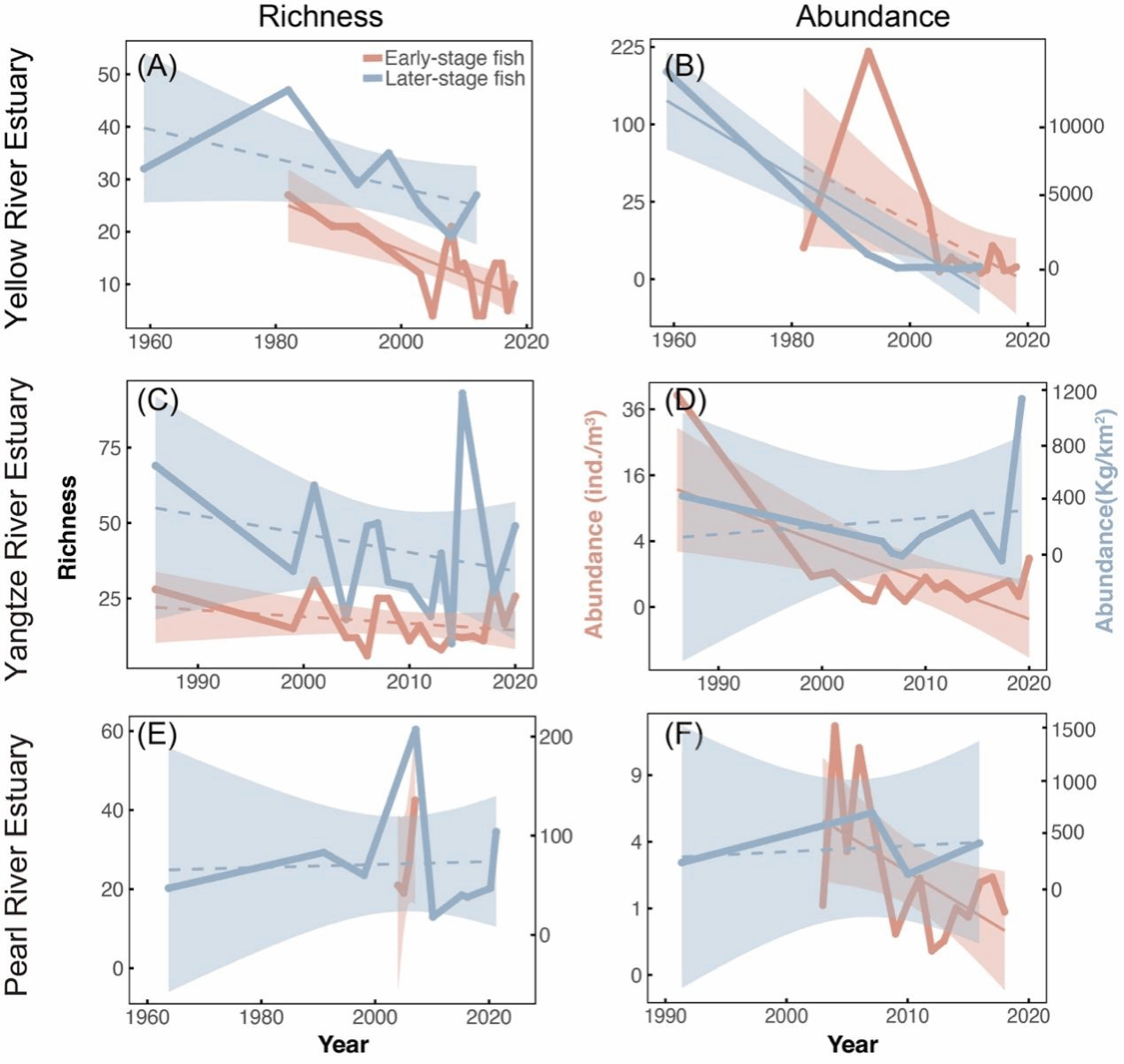 本研究以中国三大典型河口——黄河口、长江口和珠江口为研究对象。三大河口同时受到捕捞强度、上游水沙调控及气候变暖等多重影响,是揭示人类活动对河口生态系统作用机制的理想研究区。东海所河口渔业生态创新团队基于跨越半个多世纪的长期监测数据,建立了涵盖鱼卵、仔稚鱼和成鱼等不同生活史阶段的综合数据库,系统分析了鱼类丰度与物种丰富度的变化趋势。结合局部尺度(捕捞压力)、区域尺度(水沙输移)和全球尺度(海表温度)三类人类干扰指标,运用多元统计与阶段特异性分析方法,定量揭示了多尺度胁迫对河口鱼类群落结构演变的影响规律。