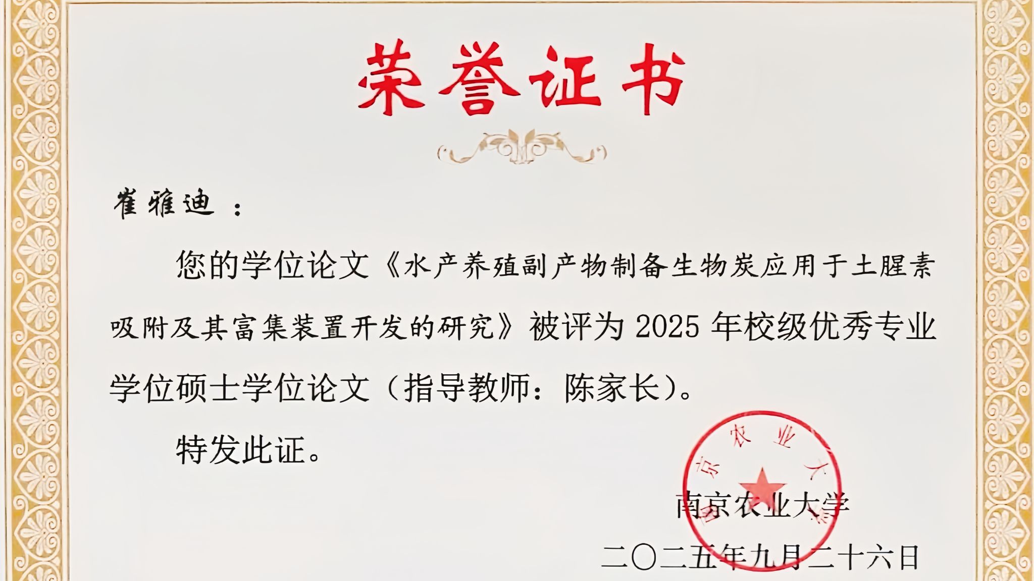 近日,无锡渔业学院2024届硕士研究生崔雅迪和官子强的学位论文《水产养殖副产物制备生物炭应用于土腥素吸附及其富集装置开发的研究》《中国电商平台销售的罗非鱼产品中重金属的流通格局与风险评估》获评南京农业大学优秀专业学位硕士学位论文。