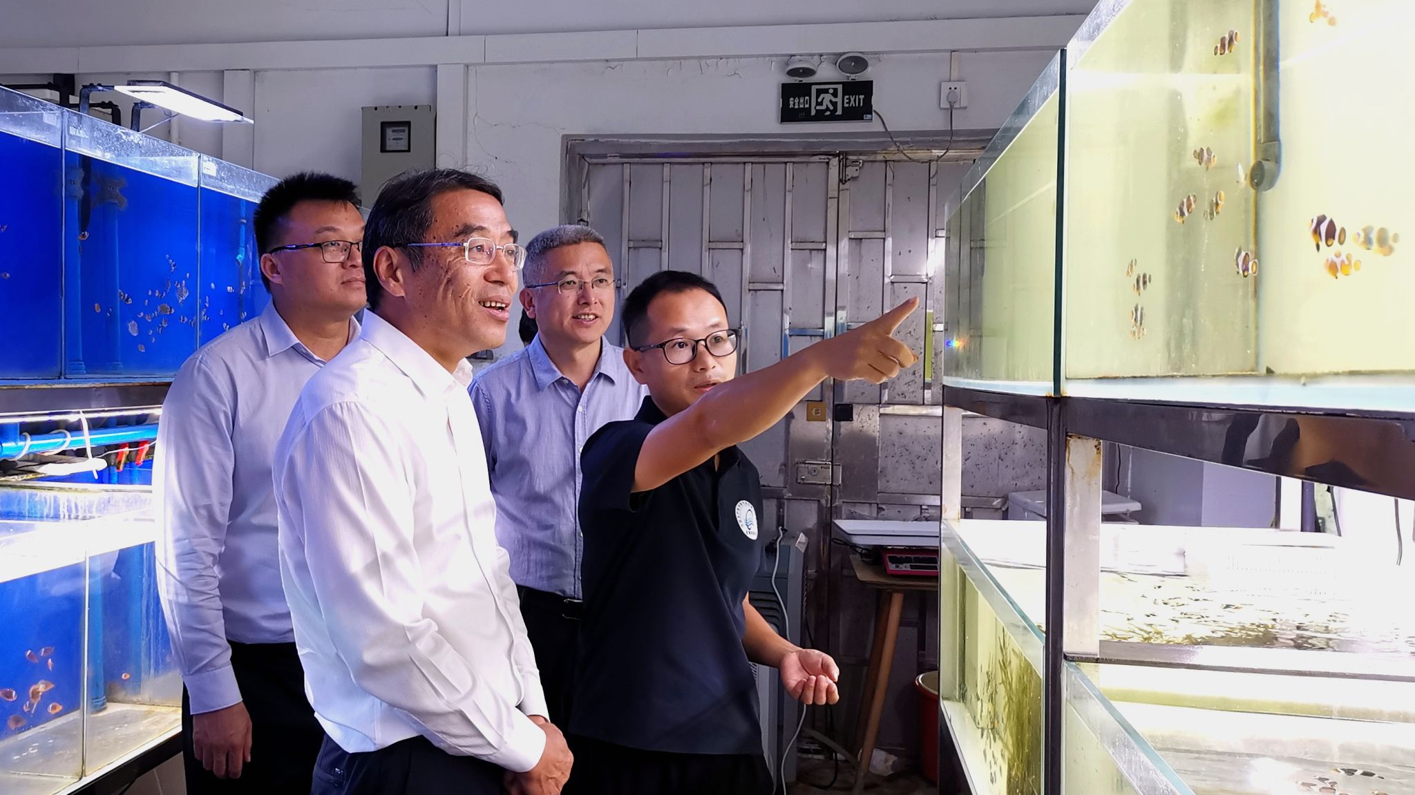 调研期间,崔国辉院长深入基地各养殖试验车间,现场听取了各科研团队负责人的工作汇报,重点了解了斑节对虾育种、金枪鱼养殖,以及金头鲷、小丑鱼、珊瑚等多个海洋牧场攻关品种的人工繁育进展情况,详细询问各类苗种培育周期、亲本来源及投喂管理等科研细节。他对在基地开展的试验研究工作及取得的成效给予充分肯定,并强调基地要依托深圳区位优势与南海海洋资源禀赋,充分发挥科研平台效能,强化成果培育与转化。