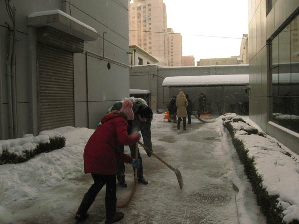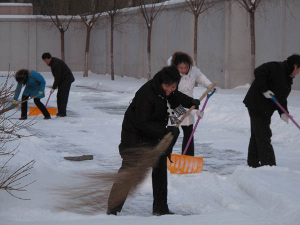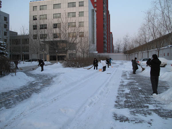 新年上班一大早,办公室成员在刘红梅副院长的带领下,顶着凛冽的寒风,自发地到院部进行扫雪,其他人员见状也积极参与,大家纷纷扛着铁锹、拿着扫帚,冒着严寒,奋力铲雪。机关团委也组织青年职工对自行车棚附近积雪进行了清扫。8点上班前,大家已将院部人行道、行车路线和门前区域的积雪清理干净,保证了我院职工正常的工作秩序。